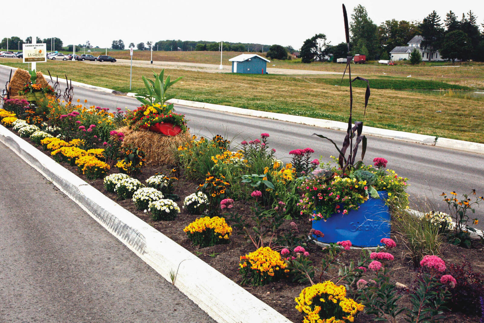 LA Gardens in Barrie was commissioned to create an entrance garden to the Barrie Fair. Owner Laurie-Ann Stuart used perennial grasses, rudbeckia, sedum, dianthus and salvia, and then filled it in with mums, asters, millet and annual rudbeckia. The final touch was adding colourful planters in a lick bucket and a pig trough set on bales and a seed spreader.