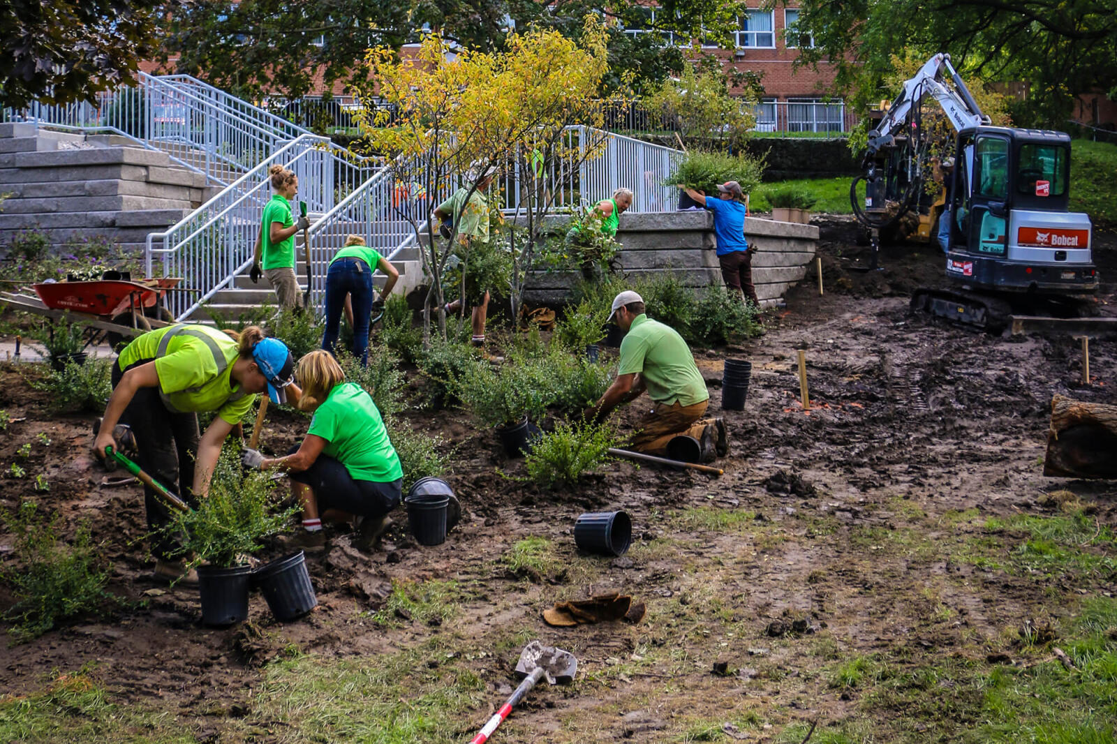 With hardscape in place, a massive planting effort by over 50 volunteers was held on Oct. 4 involving hundreds of plants and two dozen large trees.
