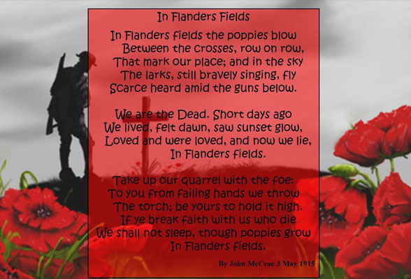In the spring of 1915, shortly after losing a friend in Ypres, a Canadian doctor, Lieutenant Colonel John McCrae was inspired by the sight of poppies growing in battle-scarred fields to write a now famous poem called ‘ In Flanders Fields’. After the First World War, the poppy was adopted as a symbol of Remembrance.