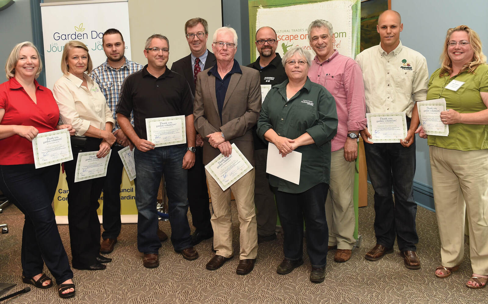 The following Ottawa Chapter members were acknowledged and given certificates for their volunteer work to beautify Ottawa public green spaces: Hansen Lawn and Gardens, Lafleur de la Capitale, Greenscape Watering Systems, Clintar Landscape Management Ottawa, Natural Impressions Landscaping, The Professional Gardener, Lindsay Landscapes, Greenlife, Horticare Landscaping, Manotick Tree Movers, CityScape, Algonquin College Horticultural Industries Program, Geosynthetic Systems, Green Unlimited, Weedman Ottawa, Peter Smit & Sons, Zone 5 Landscaping and Property Maintenance, Surgenor Truck Centre, Garden Creations of Ottawa, A Cultivated Art, Jason Smalley Landscape Design, Janice Ife Algonquin College, Les Enterprises Prebbel Enterprises and Maple Leaves Forever.
