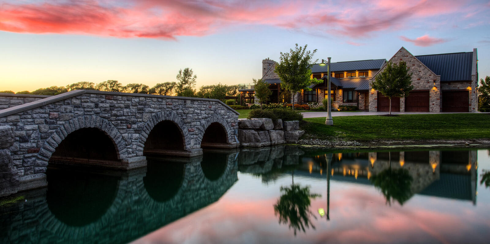 Both good luck and great design helped in the next phase of the project. A large concrete bridge was required between the the ponds to connect the driveway to the house. To create the bridge, a 16 foot earthen dam was built to hold back the water, with two large pump generators to move the water out of the construction area. “Just after we completed the bridge, a huge spring rainstorm hit that night causing the dam to collapse. It turned out perfect, as the water washed away the dam and the bridge remained completed and in place.”