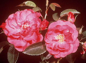 This long-shooted pillar rose owes its habit and glossy foliage to the Rosa kordessii. It can be used as a climber and will reach 3 m in a good site. It will tolerate temperatures of -35°C without winterkill. The double blooms are soft red in bud, opening to deepest orchid pink. It has a second flush of flowers in late summer. Lightly fragrant.
