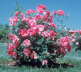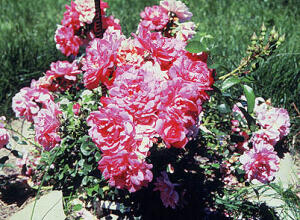 This small bush blossoms nearly continuously with semi-double, medium pink flowers. The form is somewhat loose and blowsy. It has little fragrance. The foliage is very healthy. It is difficult to get enough wood for propagation.