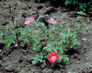 This plant is a cross with a miniature rose (Rosa polyantha) and its tiny leaves and low spreading habit bear this out. Its diminutive stature makes this a useful rose for the edging of beds or for spots where a larger rose would be out of place. The semi-double pink blooms are small but shapely and appear in profusion throughout the season. They have little fragrance. The bush appears fully hardy to -30°C or perhaps much lower.
