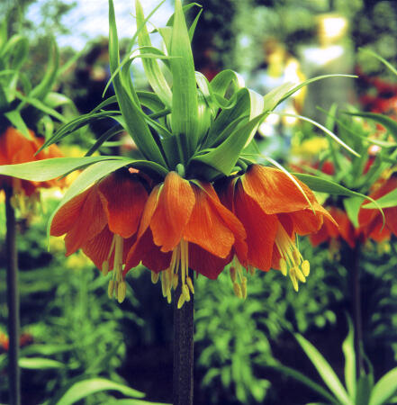 | This close up of Fritillaria imperialis rubra maxima shows a crown of blossoms at the top of a tall stem. |