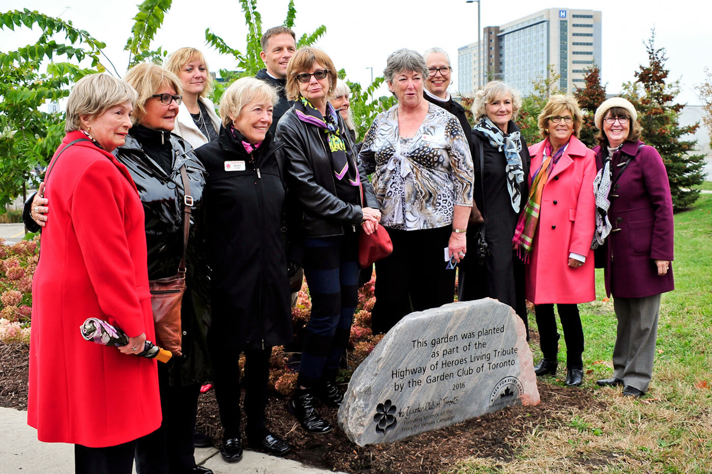 A special plaque recognizing The Garden Club of Toronto for their outstanding contribution as a founding sponsor of the Highway of Heroes Living Tribute (HOHLT) was unveiled during a special event in mid-October. Located at Keele St. and Hwy. 401, the garden is adjacent to the Coroner’s Office, which marks the end of the journey each fallen Canadian solider takes along the Highway of Heroes from C.F.B Trenton.