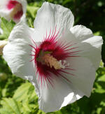 Hibiscus syriacus is a native of Asia – although Linnaeus thought it was from Syria when he named it (there is Linnaeus again – popping up everywhere…) and has the common name Rose of Sharon by some – Rose Mallow by others… This is a winter hardy shrub that can get 2-4m tall and in mid-summer can be covered in flowers. The flowers typically do not last very long but the plant has so many blooms that it gives us a good show. The flowers are usually pink in colour – and all have that unique hibiscus look of a very large stamen.