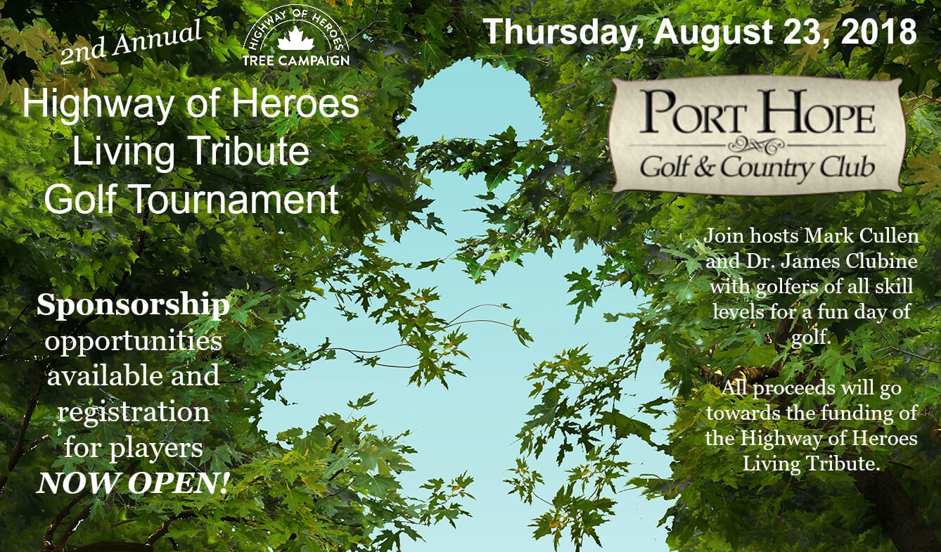 Join hosts Mark Cullen and Dr. James Clubine for the second annual Highway of Heroes Living Tribute Golf Tournament. Proceeds from the tournament will go towards funding the HOHLT.