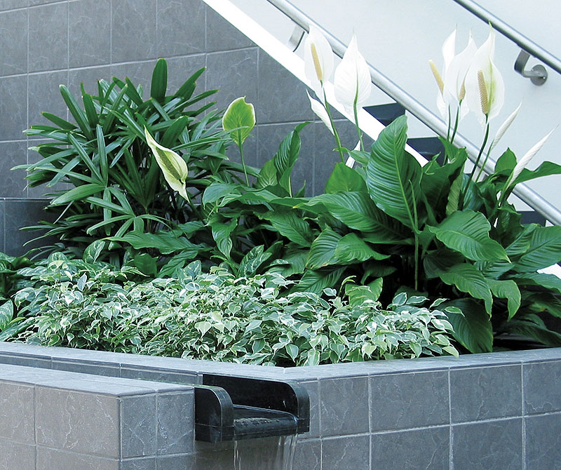| An example showing peace lilies used in a shopping mall to improve air quality. |