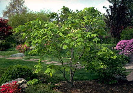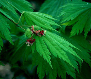 5m tall | zone 5 | Broad, deeply cut green leaves turn a brilliant scarlet in the fall. Upright, multi-branched habit. |