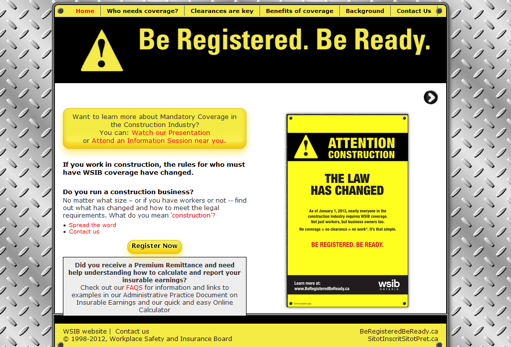 Detailed information about mandatory coverage (including exemptions), and rate group descriptions are available at www.BeRegisteredBeReady.ca. Everything you need to know about the new law and how it affects you is there. If you have questions you can’t find answers to on the website, or have questions about classification or clearances, call WSIB at 1-800-387-0750, or 416-344-100, Mondays to Fridays, 7:30 a.m. to 5 p.m.