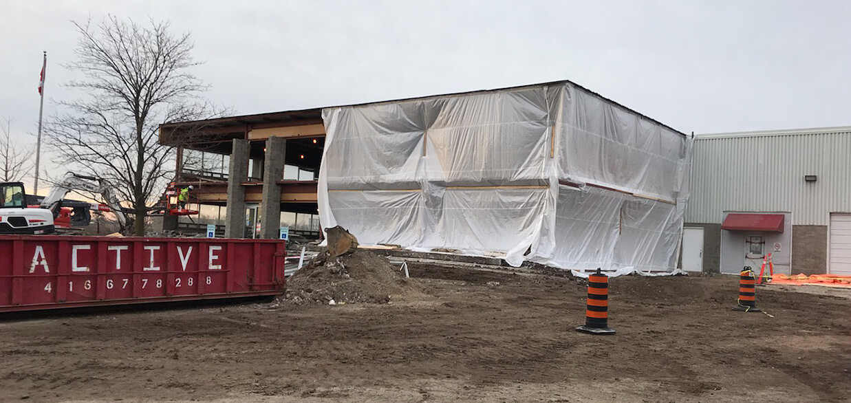▲Steel structure for the new entrance (vestibule) added and entire building has been tarped, allowing inside work to continue.
