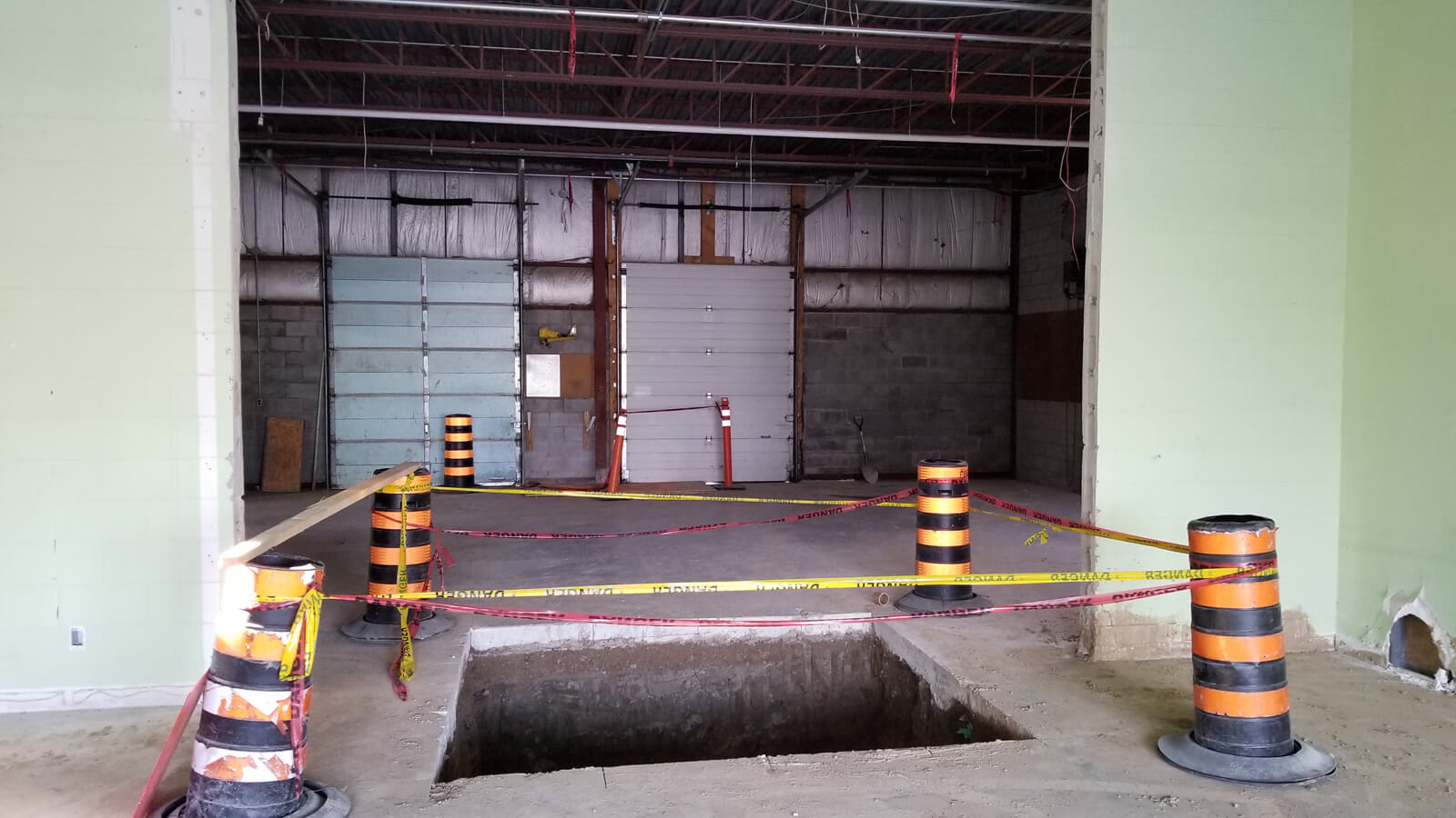 Interior work on reinforcing existing steel structure and cutting concrete floor for elevator pit and new pluming for washrooms.
