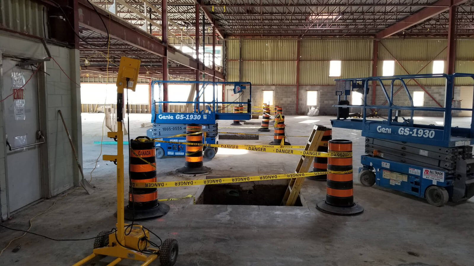 Interior work on reinforcing existing steel structure and cutting concrete floor for elevator pit and new pluming for washrooms.