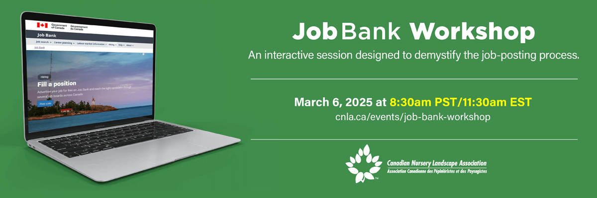 Join us for an engaging workshop hosted by the Canadian Nursery Landscape Association (CNLA) in collaboration with Job Bank: Canada’s national employment service, which is delivered by Employment and Social Development Canada. This interactive session is designed to demystify the job posting process and provide practical solutions to common hurdles faced by employers. Whether you’re new to posting jobs or seeking to streamline your approach, this step-by-step webinar will equip you with the knowledge and tools necessary to maximize your success.