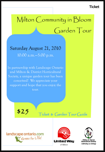 Tickets are now available for the Milton area Garden Tour on Saturday, August 21, 2010 from 10:00 a.m. to 5:00 p.m. In celebration of the Milton District Horticultural Society’s 100th anniversary, they have joined forces with Landscape Ontario to support the United Way of Milton.