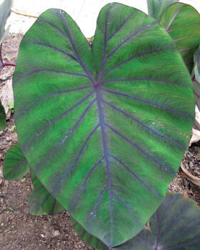 Large leaves with a velvety green base and large deep black veins. A dwarf selection, that provides huge impact in summer containers. Will grow to 80 cm tall.
