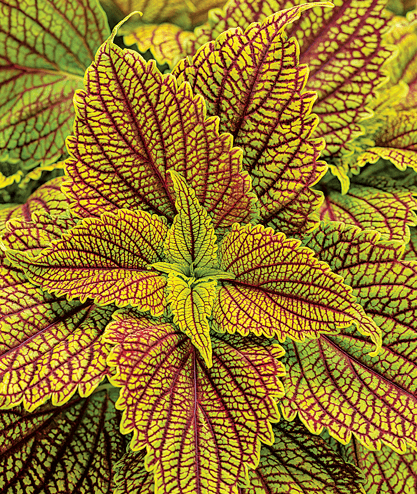 This robust coleus grows vigorously to form a bushy mound of radiant gold foliage with red venation. Like all ColorBlaze selections, it performs well in both sun and shade. In lower light, Golden Dreams will have more extensive red colouring; in brighter light it will be more gold.