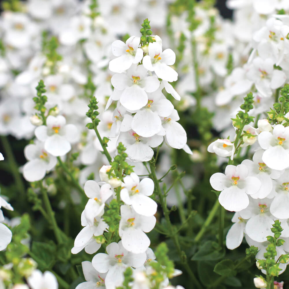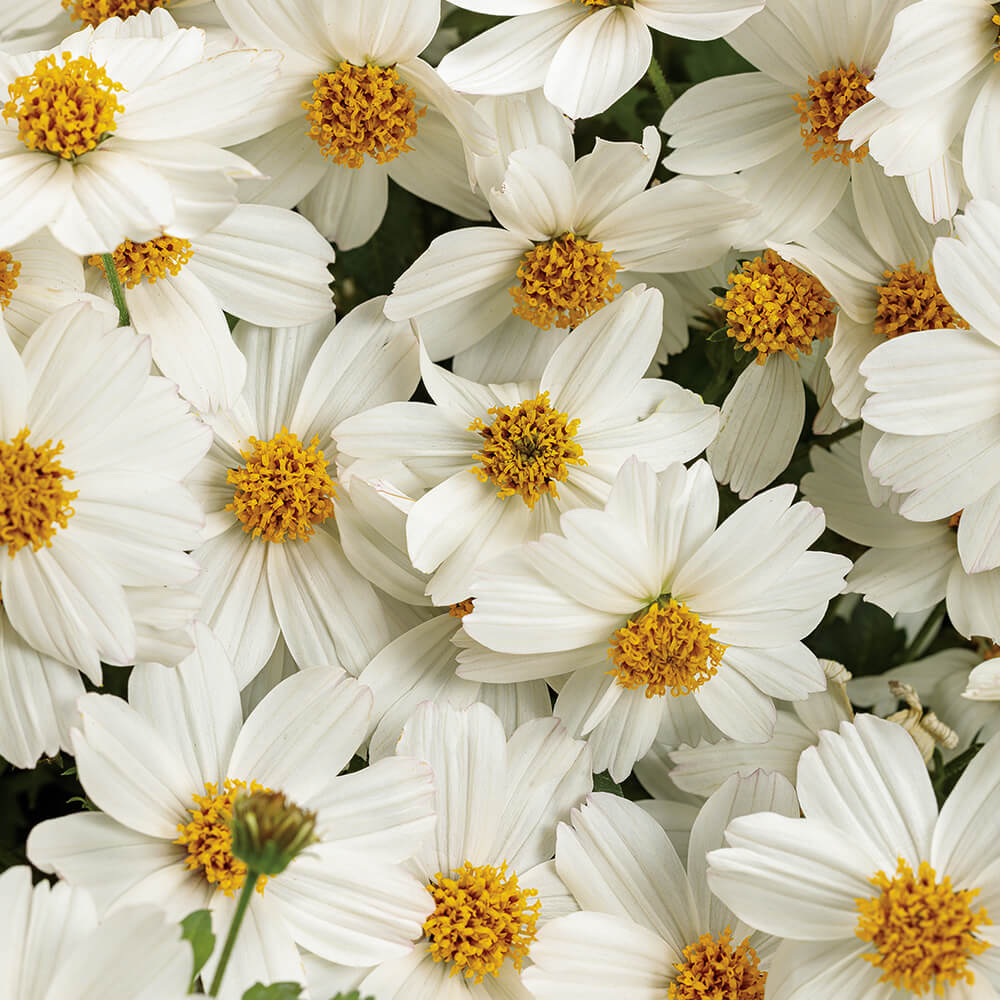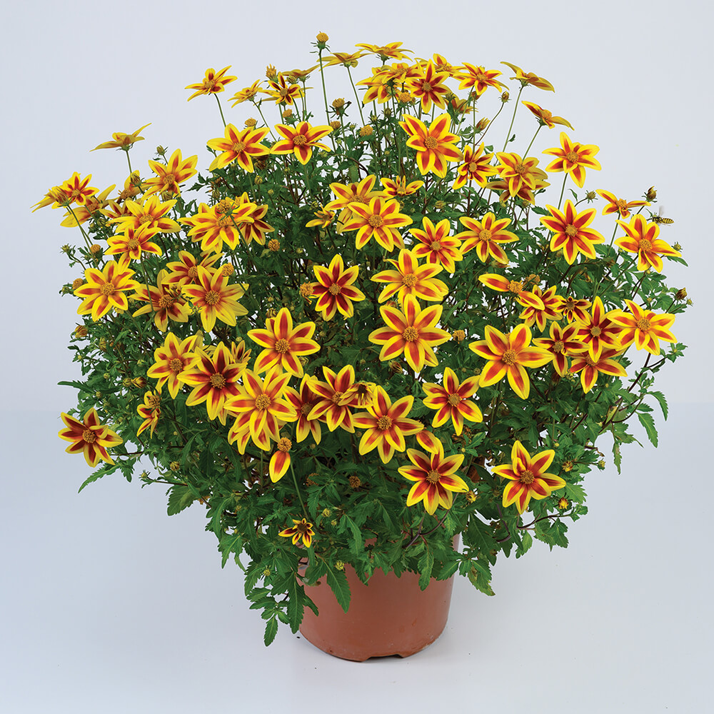 is a new pure white bidens that adds a cool touch to full sun landscapes. A showy tuft of gold in the centre of each blossom draws in pollinating bees. Petals shed cleanly once spent, leaving the plant with a tidy appearance — no deadheading required.