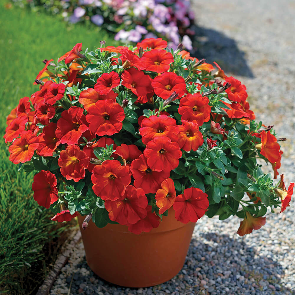 is an exciting new colour in this popular series, with large, iridescent flowers of scarlet to an orange glow and a well-branched, mounding plant habit. SuperCal Premium Red Maple has exceptional weather tolerations making it an excellent choice for a season extender (early spring through autumn).