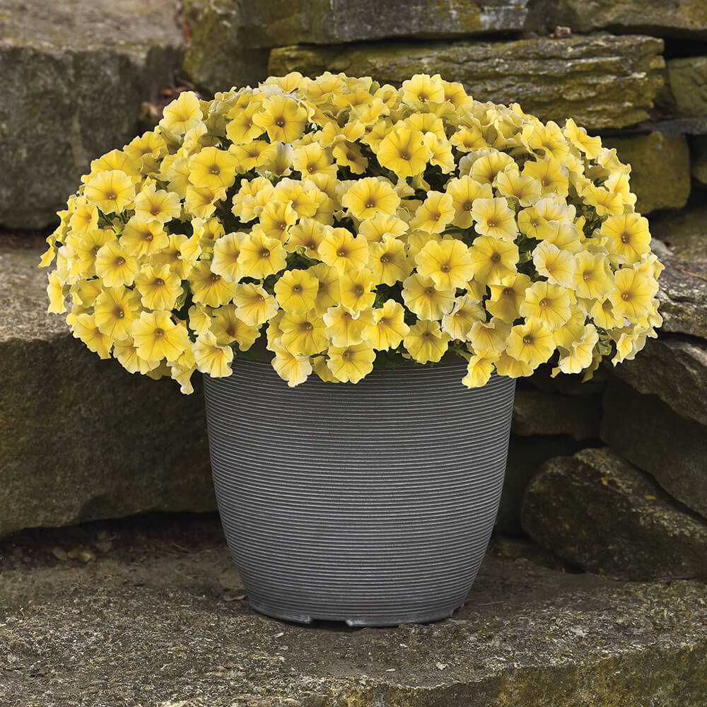 is a vibrant yellow new petchoa from seed that supplies an economical choice for greenhouses wanting the same easy production and maintenance in large containers of petunias, plus the colour intensity of calibrachoa. Caliburst has a naturally compact/medium habit, and it makes a great mixed container component.