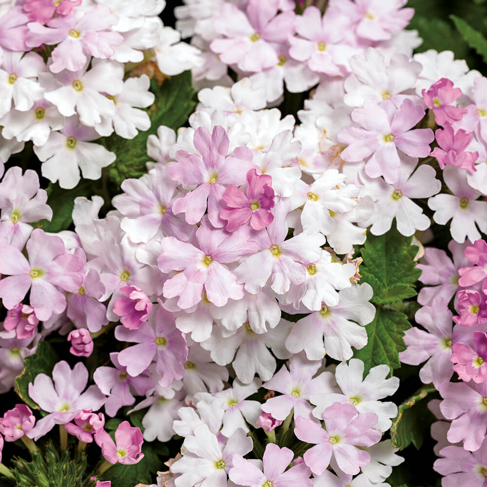 has a delicate pink flower colour, extremely vigorous growth and huge umbels that rival Superbena Whiteout and Violet Ice in size. Mounded trailing plants produce loads of continuous blooms all season without deadheading.