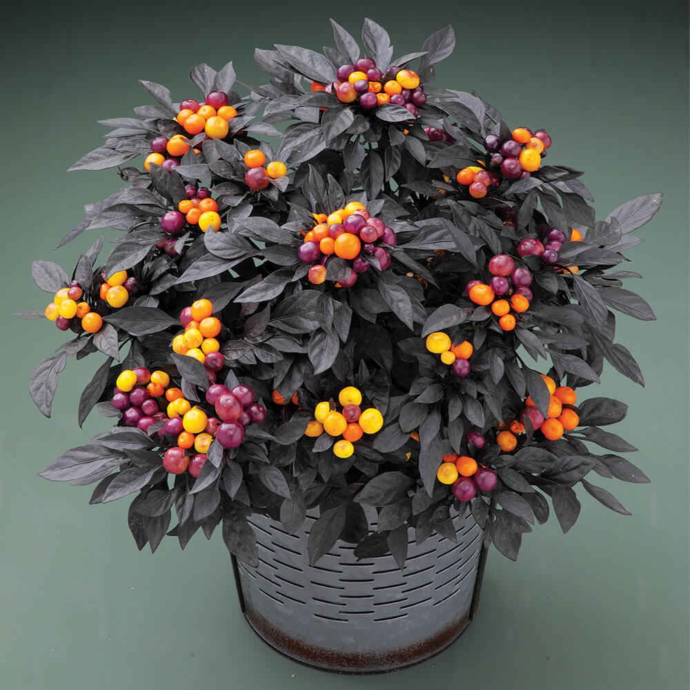 has striking black/dark purple foliage that contrasts with the vibrant, round, orange fruit produced in clusters all over the plant. Onyx Orange has an attractive compact, branching habit that makes a lovely presentation even without fruit. It is best in six-inch and gallon pots.