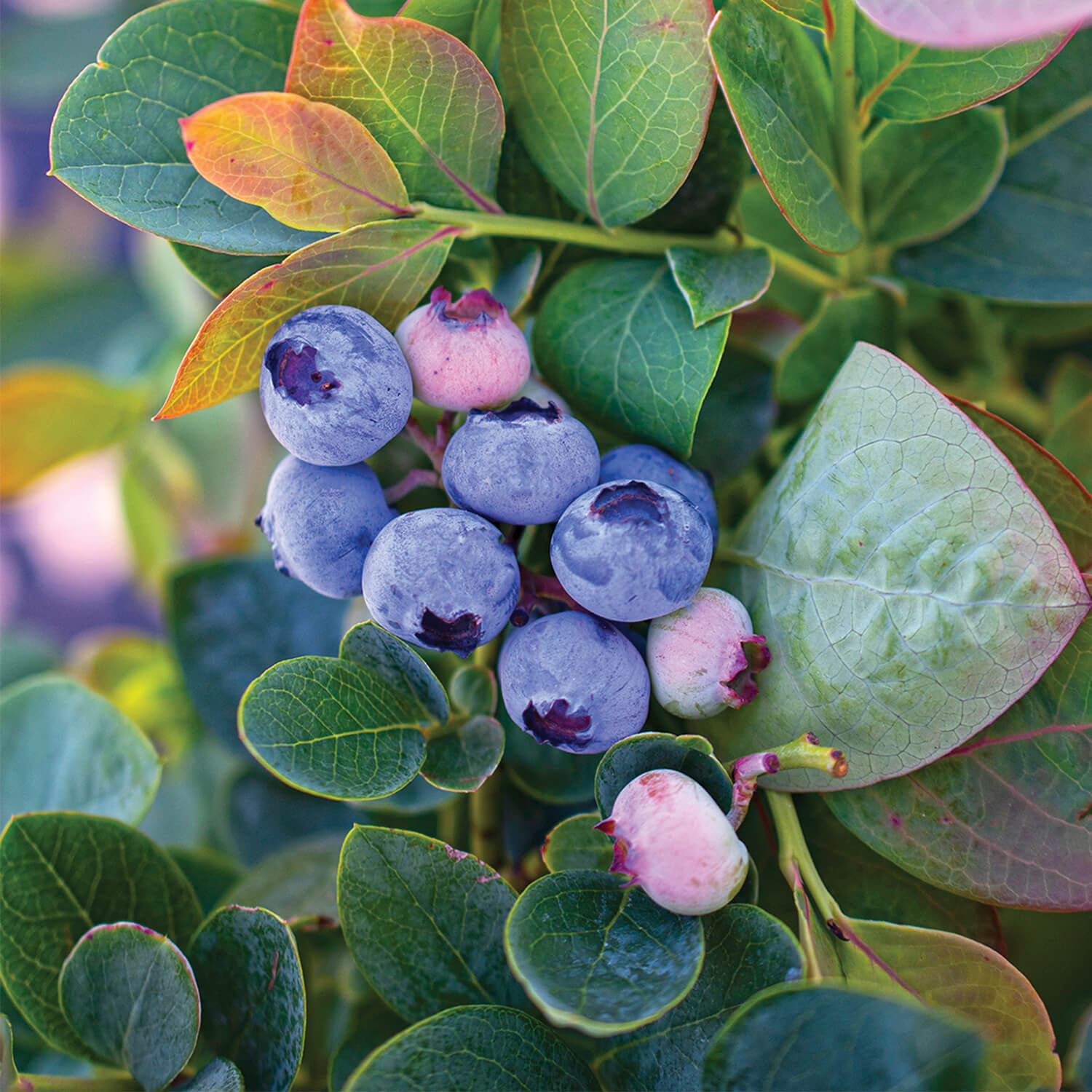 A unique blueberry with a sweet, pineapple flavour and foliage resembling eucalyptus. White flowers in the spring turn to large blueberries. Foliage has hints of silver throughout the spring and early summer before turning to emerald green in the fall.