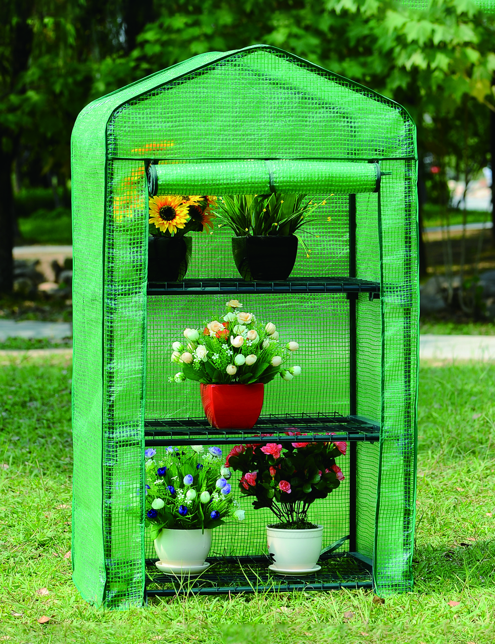 The All Season Greenhouse from Holland Imports comes with two cover options: clear to provide a balmy environment and beautiful view of the plants inside, and a thicker grid cover to protect vulnerable plants and seedlings in cooler weather.