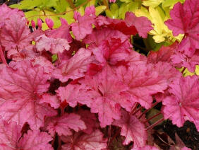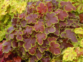 Leaves of red brown bordered in lime green, combined with a beautiful habit and broadly scalloped leaf lobes. Can be grown in full sun. Zone 5. Grows 25 cm (10 in.) tall and 35 cm (16 in.) wide. Terra Nova Nurseries