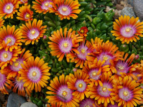In bloom, Delosperma offers a shocking colour combination. Apple-green foliage makes a glistening carpet, covered with masses of orange and magenta-pink blooms in spring. Will flower sporadically through the summer. Grows to 7 cm (3 in.) tall. Best in sun to part shade. Zone 5. Paridon Horticultural, Valleybrook