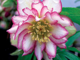 This double strain has every white petal edged in rose. The first picotee-edged double hellebore. One of Terra Nova’s Winter Jewel’s strain. Zone 6. Grows 30 cm (12 in.) tall and 60 cm (24 in.) wide. Terra Nova Nurseries