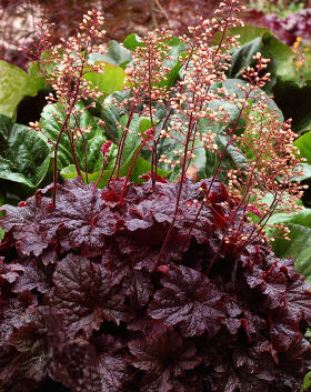 This plant changes colour with the seasons; red in spring, black in summer and maroon in fall. They are always attractive, having clean foliage in rounded mounds. White flowers on dark stems hover above the foliage. Zone 5. Grows 22 cm (9 in.) tall and spreads 35 cm (14 in.). Terra Nova Nurseries