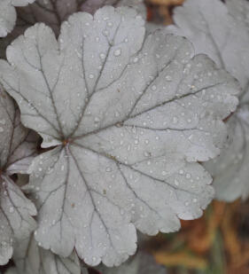 Metallic silver-green foliage with purple veins and eggplant-purple undersides, the early spring foliage is almost pure silver. In late spring, sports large white flowers on chocolate brown stalks. Zone 4. Grows to 30 cm (12 in.) tall. Part shade. Paridon Horticultural