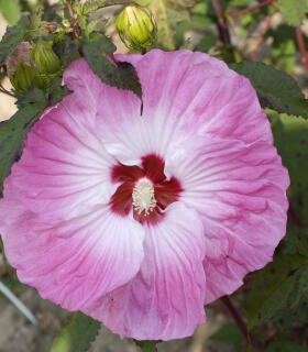 ‘Tie Dye’ is an improved bicolour selection with huge 20-25 cm (8-10 in.) flowers. Showy ruffled, bright pink and white pinwheel flowers with a cherry red eye. Indeterminate bloomer. Zone 5. Grows 120 cm (4 ft.) tall. Walters Gardens