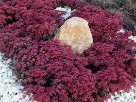 Giant 22 cm (9 in.) flower heads are the size of volleyballs. Flower colour is brilliant raspberry and visible from 90 meters away. Earlier blooming than most other Sedums, ‘Razzleberry’ is ultra-compact, with 17.5 cm (7 in.) tall smoky blue-gray foliage. Blooms early summer until fall. Zone 4. Paridon Horticultural