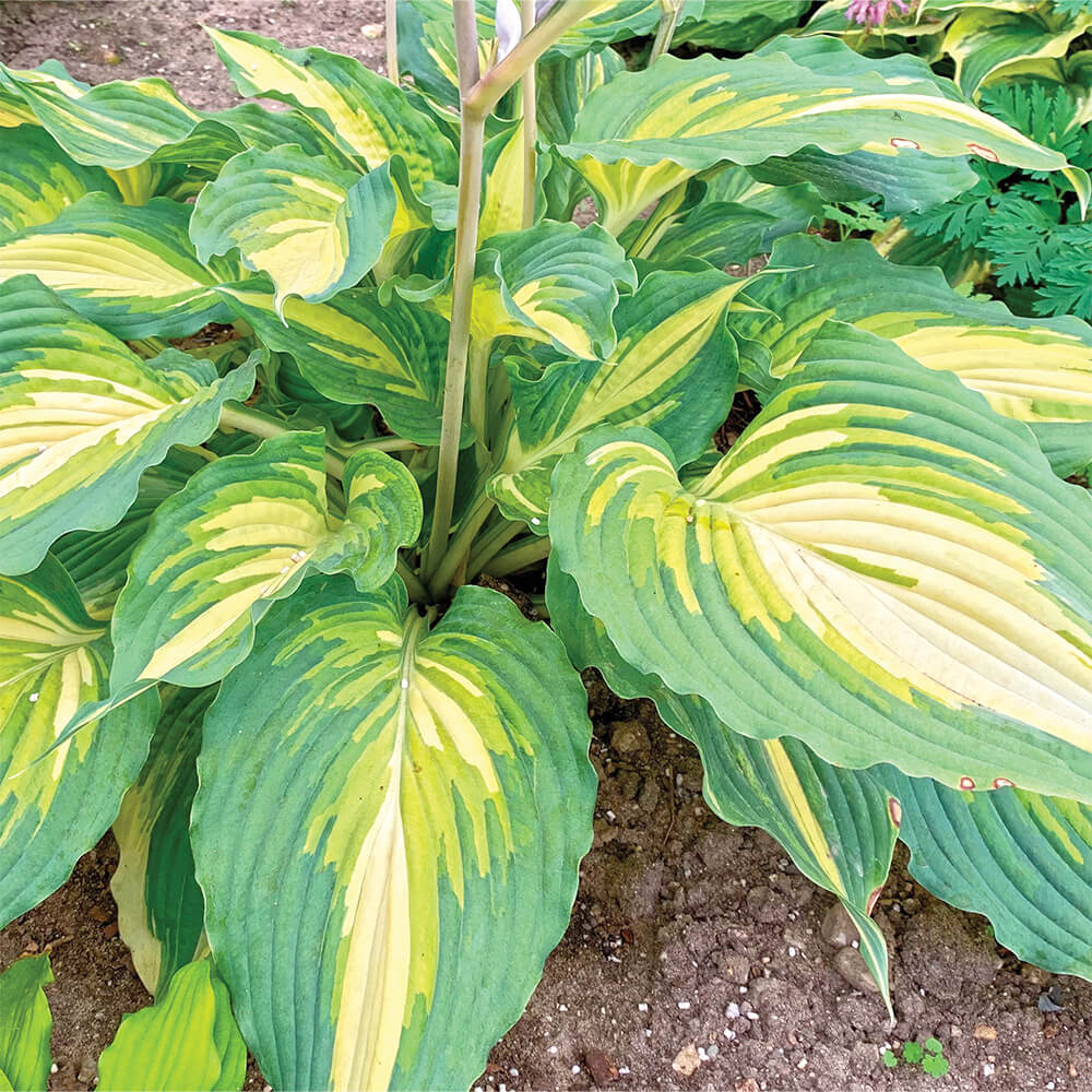 bears long, heart-shaped green leaves with chartreuse jetting that bleeds into the creamy white centre. It’s made extra special by variegation that extends from petiole to leaf tip and wavy pie crust leaf edges. Tall scapes hold large clusters of white flowers in early summer. (Hardiness Zones: 3-9)