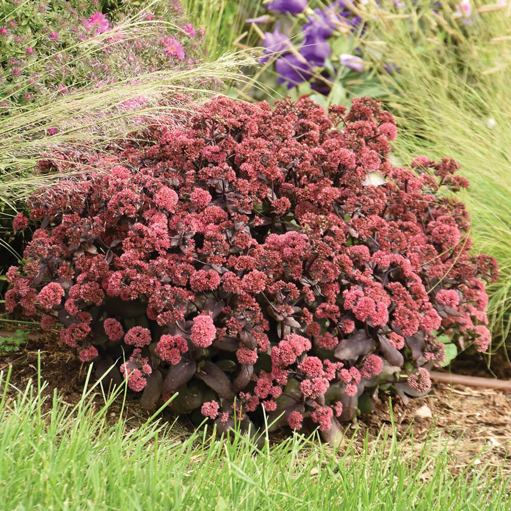 has deep purple foliage when it emerges each spring. The full, domed habit is adorned in late summer with large clusters of mauve buds which open to reveal rose-red flowers that transition to dark red seed heads. (Hardiness Zones: 3-9)