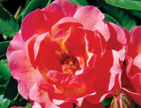 A floribunda with sprays of semi-double blooms of charming orange-pink with a yellow-orange base. Will produce waves of colour in the garden throughout the season.