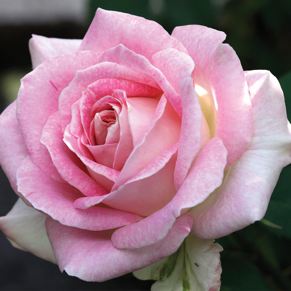is a hybrid tea rose from celebrated breeder Christian Bédard. Each bloom has 25-30 petals and a butter-yellow centre, a white base and light pink outer petals, giving it the look of delicate, hand-painted porcelain. This selection has a sweet fragrance, attractive dark green foliage and good resistance to powdery mildew and rust fungus