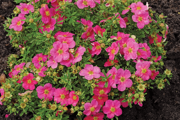 A unique display of sweet pink flowers accentuated with a white star in the centre of each bloom. A healthy, dense plant that holds its flower colour well. Blooms from spring to fall. Hardiness zone 2.