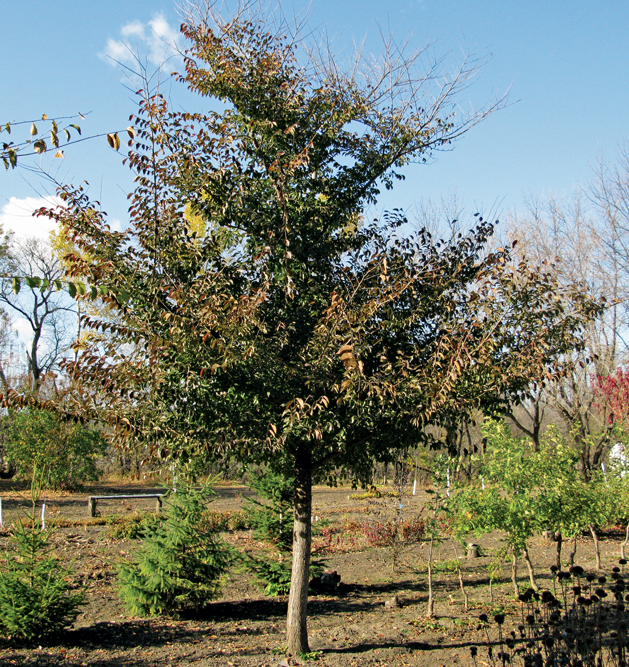 Night Rider is a hybrid between Japanese elm and Siberian elm that has rapid growth, upright, rounded crown form and is highly-resistant to Dutch elm disease. It exhibits good cold hardiness and foliage turns purple in the fall. This tree is adaptable to a wide variety of soils. Night Rider is an excellent street tree since it is very tolerant to the urban environment. Mature height is 12 metres with a spread of 10 metres. Hardiness zone 3.