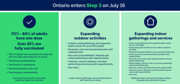 The Ontario government announced it is moving the province into "Step Three" of the "Roadmap to Reopen" plan at 12:01 am on July 16, 2021.