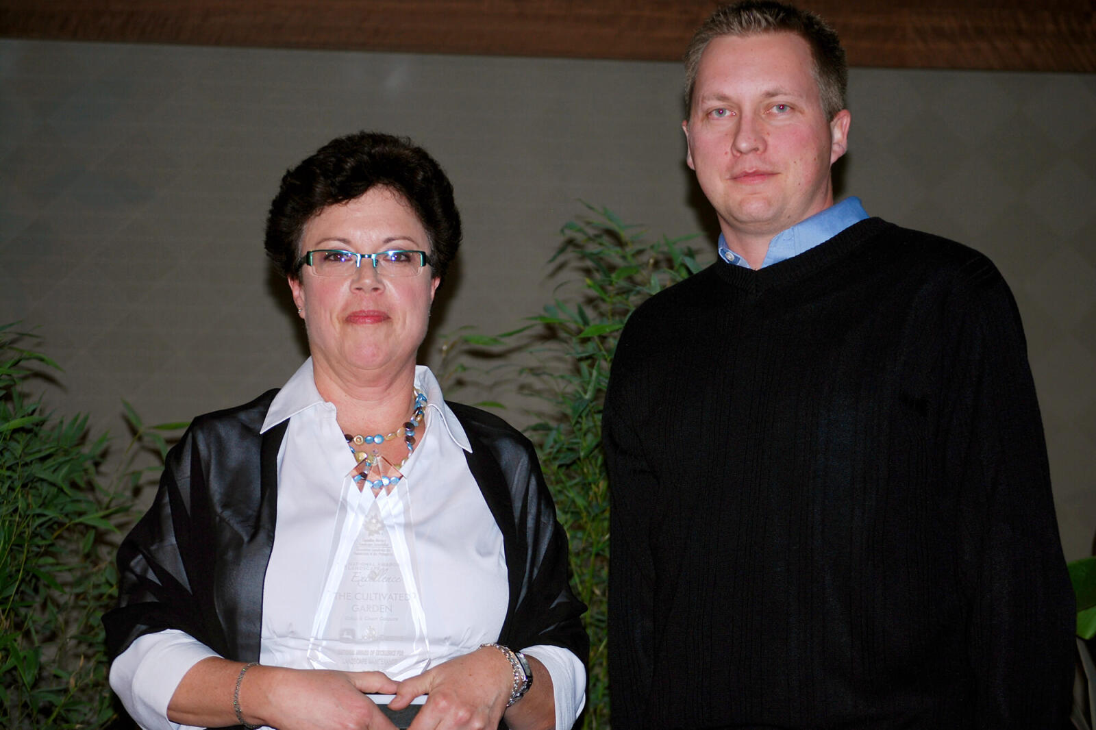 woman and man on stageBarbara Rosensweig of The Cultivated Garden,receives the John Deere Award of Excellence for Landscape Maintenance from Jeremy Vandehaar of John Deere Ltd.