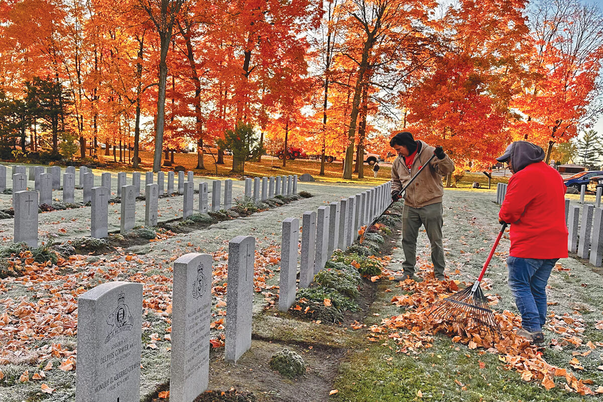 The perfect fall day provided ideal conditions for the crew to enhance the beauty of the grounds prior to Remembrance Day ceremonies. After a heartfelt thank-you from Nicolas McCarthy, director of marketing and communications for Beechwood Cemetery, followed by a few words from Thomas Hoyle, president of the Ottawa Chapter, volunteers set out with a sense of purpose and their landscape maintenance tools and equipment to transform the grounds.