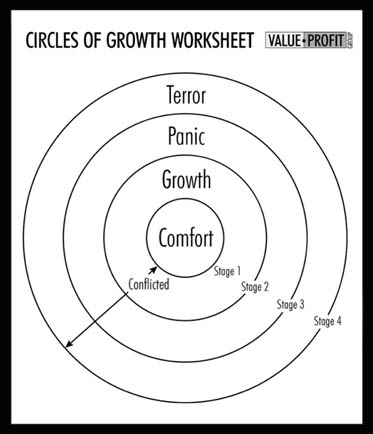 When you move into the Growth Zone, you become challenged and stretched. The farther out on the growth circle you move, the more challenging things are. It’s here that you test new skills, learn new things, apply your talent and wisdom in a new way, and generally ‘grow’ your experience and scope of competence. You expand your inner circle of comfort by regularly moving into growth, trying something new until you get it right and the new experience becomes comfortable. However, the rubber really hits the road when you are thrust beyond gradual growth and are shoved head-first into the Panic Zone. The Panic Zone occurs when you end up in so many areas just to attend your business. It becomes an area with which you are not comfortable, or have not had the time, resources or interest to grow comfortable. It becomes overwhelming in quantity, complexity and urgency. |