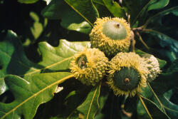 | Fruit | Large crops of acorns every two to three years, valuable to wildlife. “The acorn cup is rough, shaggily fringed near its rim and almost envelopes the acorn like a bur” (Jacobson). |