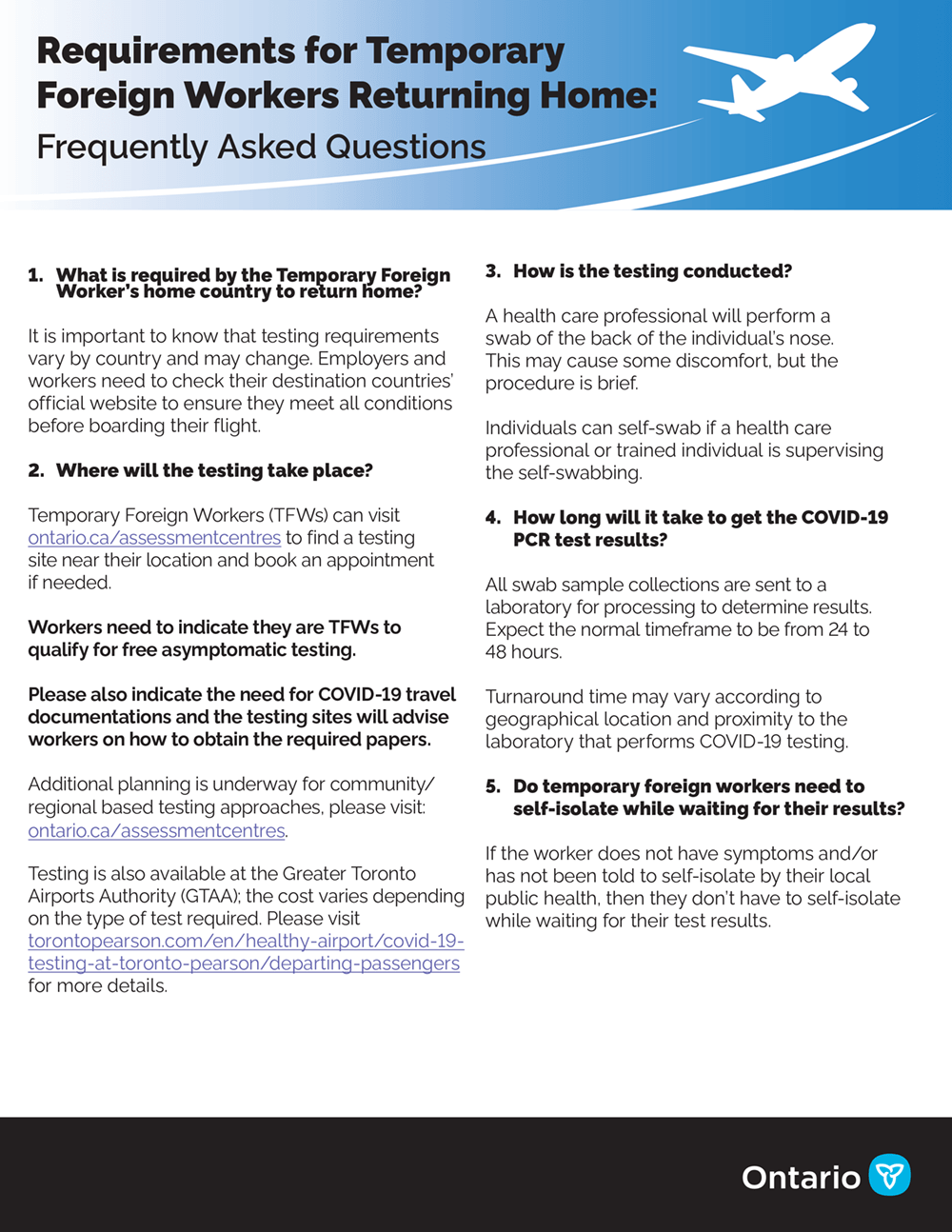 The Ontario government recently announced changes to the COVID-19 Provincial Testing Guidance and has provided a list of Frequently Asked Questions (FAQ) to support Temporary Foreign Workers (TFWs) returning home safely.