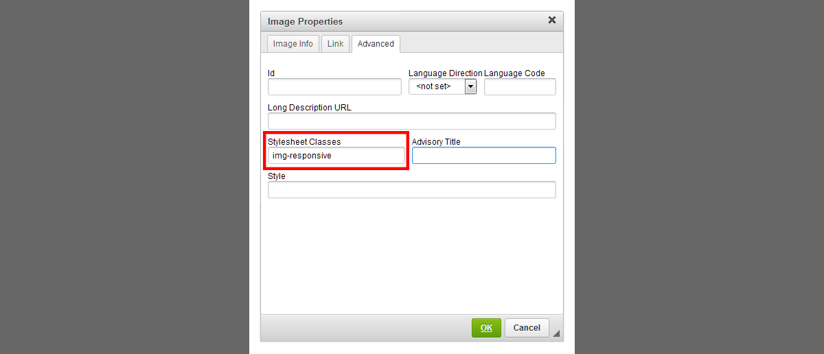 8. Under the Stylesheet Classes field, type img-responsive