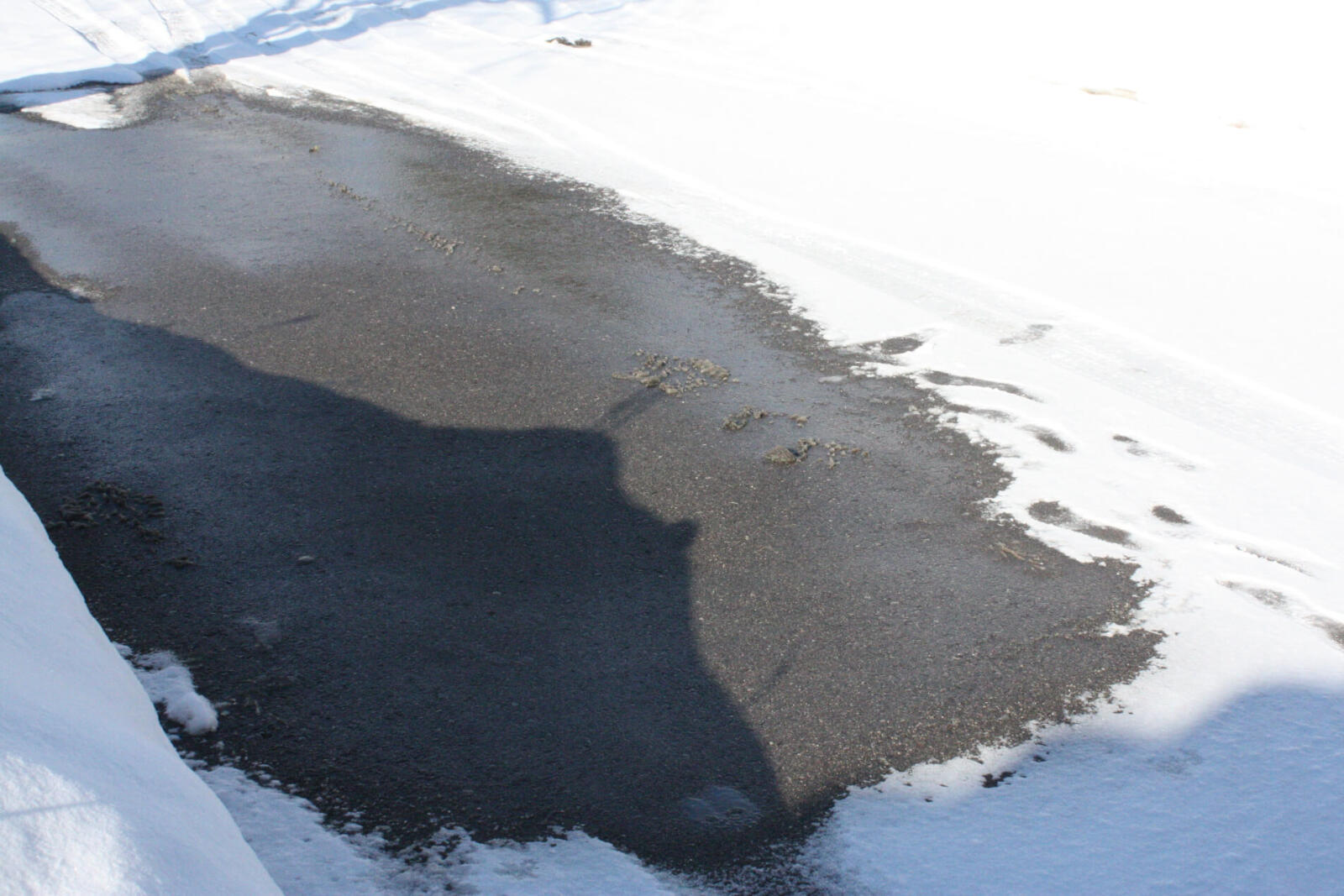 Over the following week a warm spell melted all the snow, but we had no rain to wash away the salt brine that remained on the left side of the driveway. Then we got another small snowfall and the same thing happened. The left side of my driveway was bare and damp, and the right side was covered in snow.